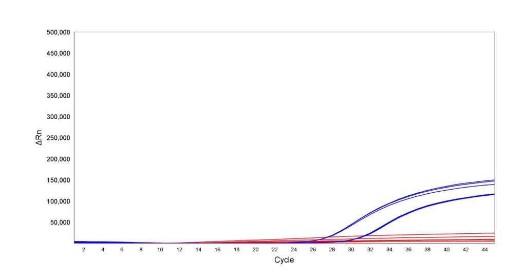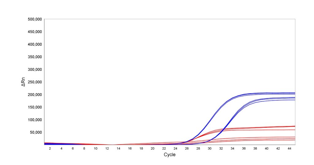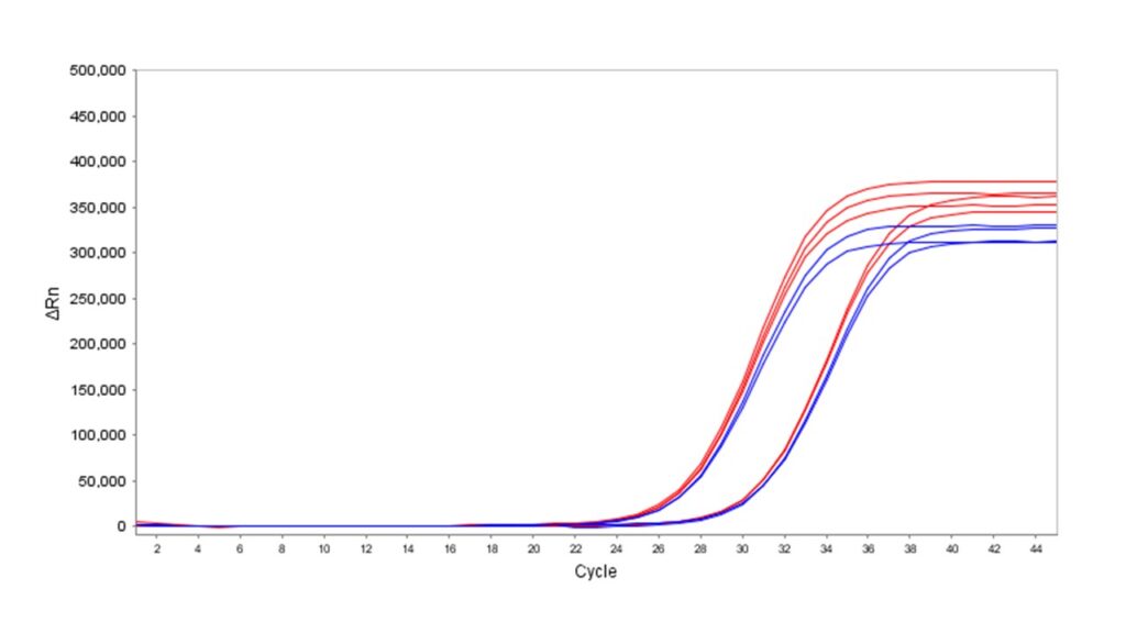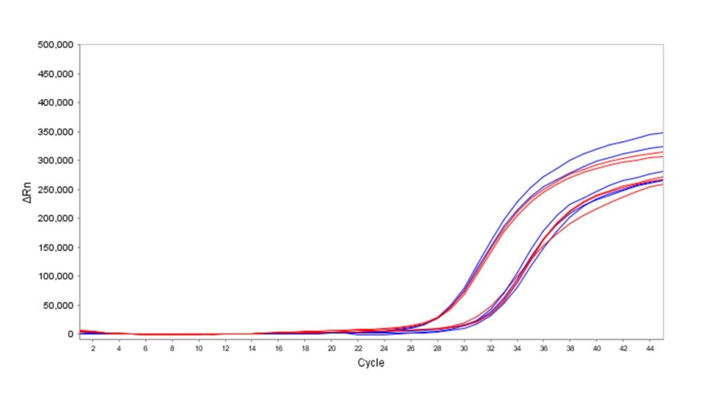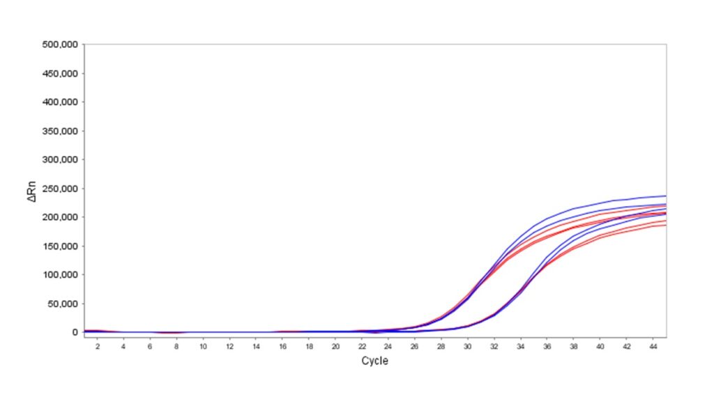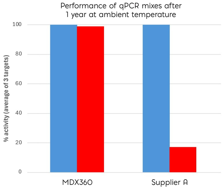 Liquid Stable Flex DNA qPCR Mix (MDX360) was evaluated for long-term stability at ambient temperatures (15 – 25°C) and compared with a leading supplier’s master mix (Supplier A) stored either at -20 °C (blue) or at ambient temperature for 12 months (red). Multiplexing capacity and sensitivity were assessed using triplex assays with TaqMan probes and two template dilutions. MDX360 stored at 15 – 25°C for 12 months showed no significant loss of performance, as measured by fluorescence intensity and Ct values. In contrast, Supplier A’s mix exhibited reduced performance when stored under the same conditions. These results confirm that MDX360 maintains full stability and performance when stored at ambient temperature for at least 12 months.