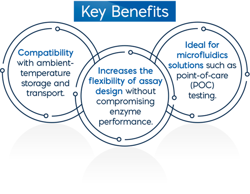 Glycerol is commonly used to protect enzymes during storage, but it interferes with lyophilization and air-drying. By removing glycerol and applying our formulation expertise, we help preserve enzyme activity while enabling room-temperature storage, simplified logistics, and greater flexibility in assay development and commercialization.