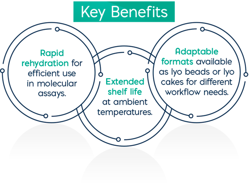 At Meridian, we help assay developers create ambient temperature-stable assays without compromising performance—thanks to our specialized stabilization services for key molecular reagents like enzymes, dUTPs, and master mixes. Whether through lyophilization, air-drying, or our proprietary glycerol-free enzyme technologies and lyo-ready mixes, we deliver tailored solutions that extend shelf life, enhance sensitivity, and eliminate cold-chain requirements. Our expertise streamlines workflows, reduces costs, and speeds up time-to-market for qPCR, isothermal amplification, and Next Generation Sequencing (NGS) assays—fueling innovation in infectious disease, oncology, and beyond.