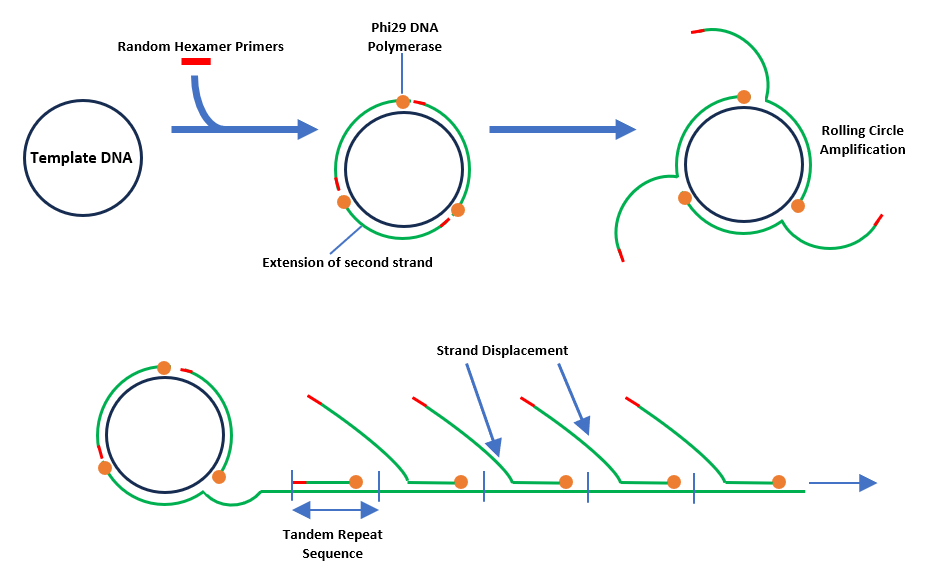 Rolling circle amplification (RCA) is an efficient isothermal amplification method for synthesizing ultralong ssDNA by using a circular DNA template and a primer to generate long, concatemeric DNA strands. A strand-displacing DNA polymerase (Phi29 DNA polymerase) continuously synthesizes DNA, moving around the circular template and producing multiple tandem repeats of the original sequence. This process yields high-molecular-weight DNA, making RCA ideal for applications such as genomic studies, molecular diagnostics, pathogen detection, and single-cell analysis.