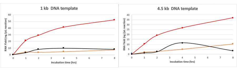 In vitro transcription reactions were assembled, according to the manufacturer’s recommended protocol, using 0.1 ng of dsDNA template encoding a 1 kb or 4.5 kb RNA. The reactions were incubated at 37°C for up to 8 hours with lyophilized Glycerol-Free T7 RNA Polymerase (HC) (MDX201) (red), NEB T7 RNA Polymerase (orange) and ThermoFisher T7 RNA Polymerase (black). These samples were tested by performing In vitro transcription reactions against MDX201 before lyophilization, NEB T7 RNA Polymerase and ThermoFisher T7 RNA Polymerase. Transcription reactions were purified using a column-based RNA purification kit and quantified on spectrophotometer. These results demonstrate that a considerably higher yield of RNA was synthetized using MDX201, and that MDX201 provide a greater transcript integrity after extended duration of RNA synthesis reactions compared to other manufacturers’ kit.