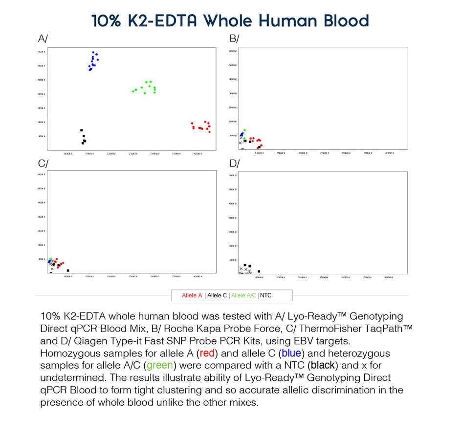 Lyo-Ready Genotyping Direct qPCR Blood has been optimized to provide highly specific allelic discrimination as demonstrated by excellent cluster separation, even in the presence of PCR inhibitors found in blood, serum or plasma. Furthermore, it can be used in a liquid or lyophilized format to create ambient-temperature stable assays, making it ideal for point-of-care (POC) devices.