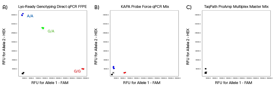 Healthy FFPE lung tissue (WT) and lung tumor tissue containing the tumor angiogenesis associated PDGFRA1 mutation were run with A/ Lyo-Ready Genotyping Direct qPCR FFPE (MDX168) following extraction with the extraction buffers provided or purified using Qiagen QIAamp DNA FFPE Tissue Extraction Kit and analysed with B/ KAPA Probe Force qPCR Mix (Roche) and C/ TaqPath ProAmp Multiplex Master Mix (ThermoFisher). Homozygous Allele G (red) and allele A (blue) and heterozygous Allele G/A (green) with a NTC (black) and x for undetermined. The results illustrate that MDX168 shows greater allelic discrimination and tighter clustering even in the presence of crude FFPE tissue extracts in comparison to other commercially available master mixes using purified gDNA.