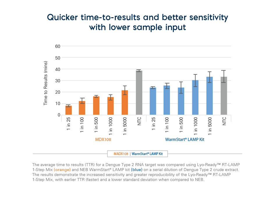 Lyo-Ready LAMP and Lyo-Ready RT-LAMP 1-Step Mix can both be used directly as a liquid mix, or lyophilized, without changing the sensitivity of the assay. The master mixes are 4x concentration, this means that in a 20 L reaction, 5 L the master mix and 1 L of primers and probes are used allowing for up to 14 L of sample to be added, however if the master mix, primers, and probes are lyophilized, then up to 20 L of sample can be added.
