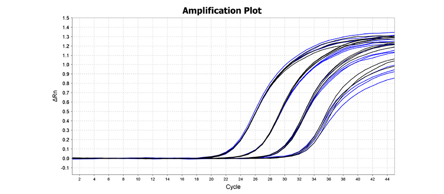 Efficient and sensitive amplification with both wet (black) and lyophilized (blue) PCR tests