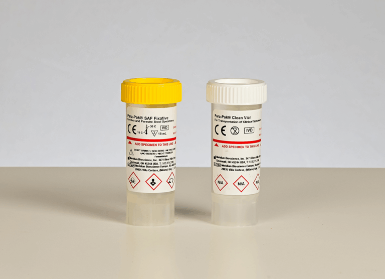 For collection, transportation, preservation, and examination of stool specimens for intestinal parasites. Contains SAF and Clean vials.